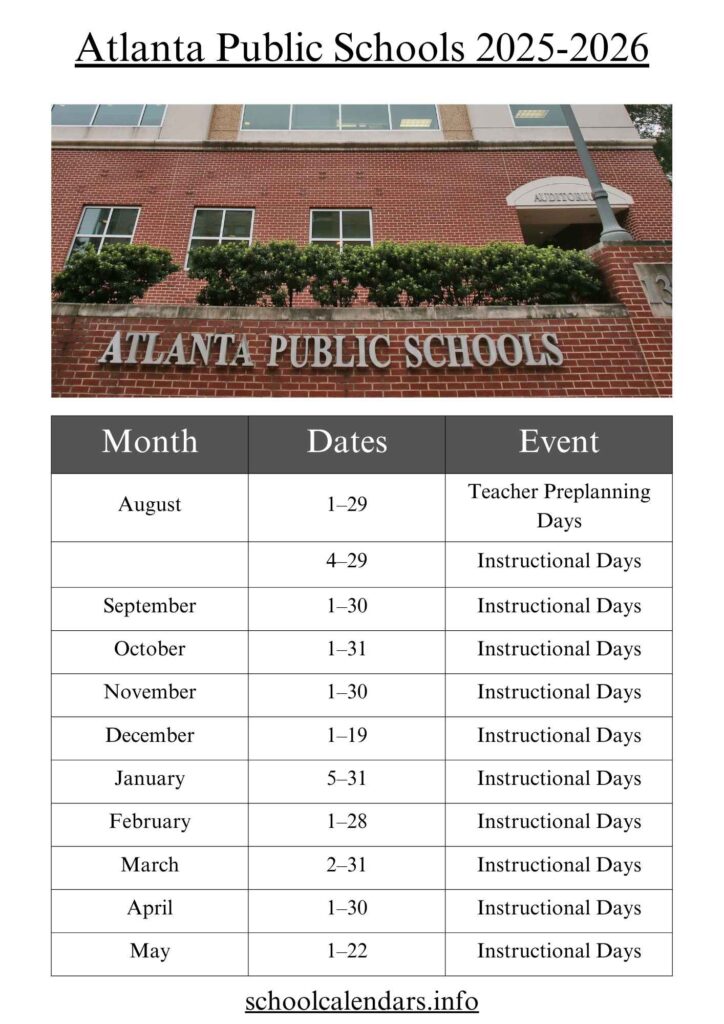Atlanta Public Schools Calendar – Atlanta Public Schools (APS) for the academic year is scheduled to begin on August 4, 2025, with the first day of school for students. The school year will end on May 22, 2026. The calendar includes 180 direct days, divided into two semesters. The first semester ends on December 19, 2025, and the second semester ends on May 22, 2026. The final exam is usually conducted during the last week of each semester. Specific dates for the final exam and holidays are subject to change and should be confirmed with individual schools or APS district calendars.