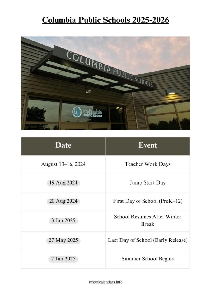 Columbia Public School (CPS) is dedicated to providing a high-quality education that prepares students for success in college, career, and life. The 2025-2026 academic calendar of the district has been designed to support student learning, professional development, and community engagement. The major dates include the first day of school on August 13, 2025, and the last day on May 29, 2026.