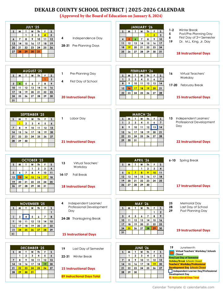 Dekalb Schools Calendar: 2025-26 Dekalb County School District Educational Year, July 28-31, starts with a pre-plan, starting from 2025, ahead of the first day of school on August 4. The first semester ends with winter break from December 19-31. The semester examination and student dismissal occur just before the break. The second semester begins on January 6, 2026, with MLK Day observed on January 19.