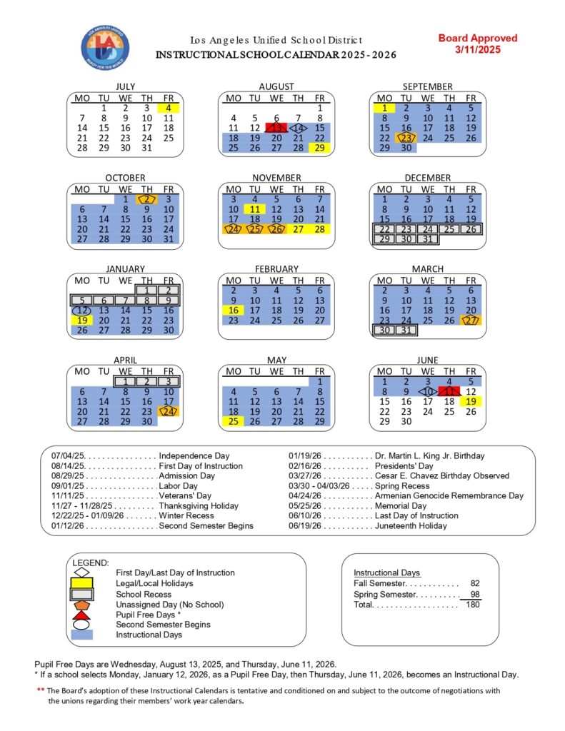 Lausd School Calendar – Los Angeles Unified School District (LAUSD) 2025-26 Educational Year Middle – In August, temporarily ends at the end of Monday, 11 August or Thursday, 14 August 2025, and May (May 29, 2026). The district will maintain 180 instructional days, with a Great Week Thanksgiving break (Nov 24–28, 2025), with a three-instructionn week winter break (Dec 22, 2025 -Jan 9, 2026), and a spring break (Mar 30 -PR3, 2026).