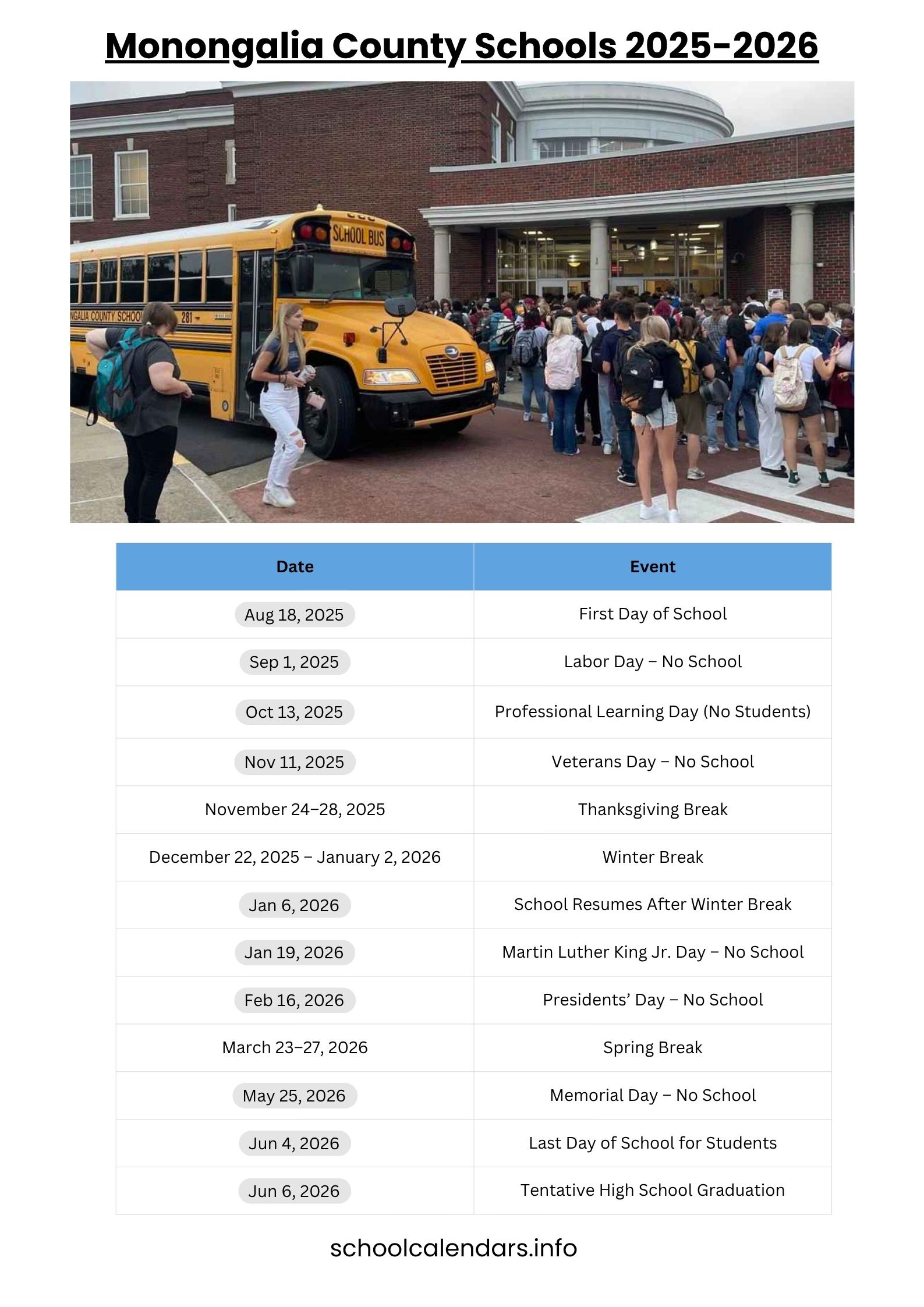 The winter break runs from December 22, 2025, through January 2, 2026, giving students time to relax. In the second semester, schools will close for Martin Luther King Jr. Day on January 19, 2026, and Presidents’ Day on February 16, 2026. Another holiday includes Memorial Day on May 25, 2026. The school year ends with the last day of school on June 4, 2026, while graduation is tentatively scheduled for June 6, 2026.